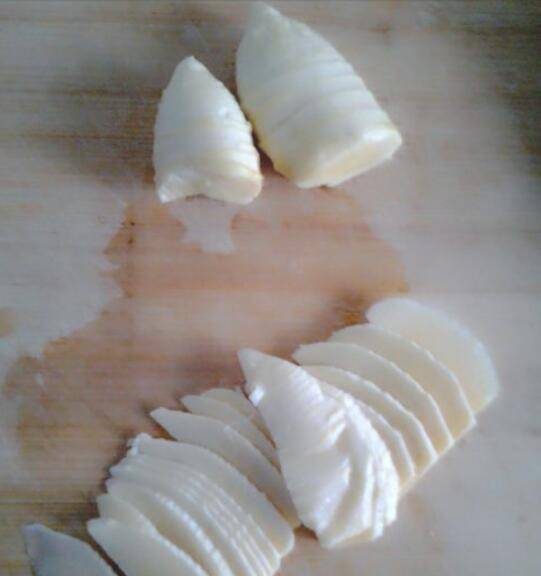 2、大一点的笋,一般是竖着从中间切一刀,然后再把一半的冬笋竖着切成薄片,一般切的厚度为2-3mm。
