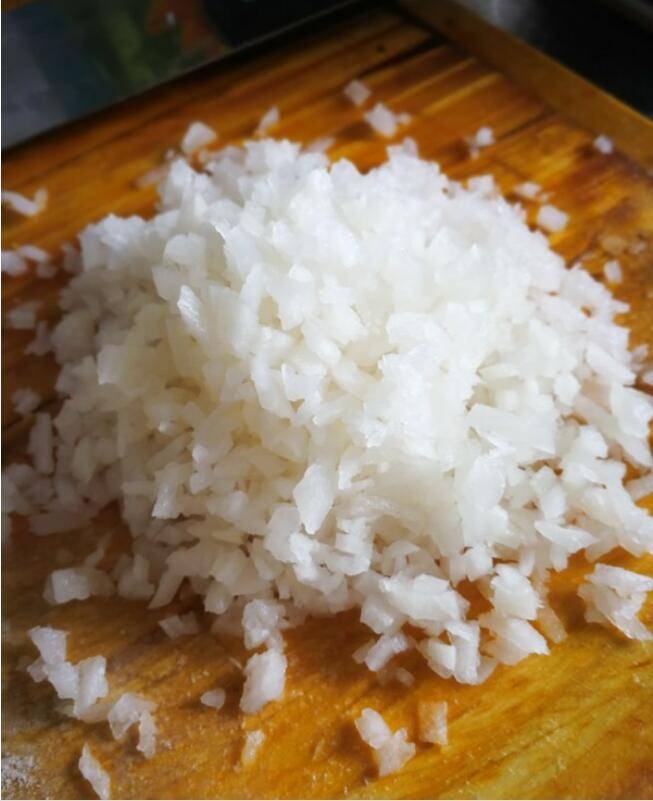 1、白萝卜(去皮,也可不去皮)切碎,加入一点盐,拌匀,静置十分钟。这一步是杀去白萝卜多余的水分。