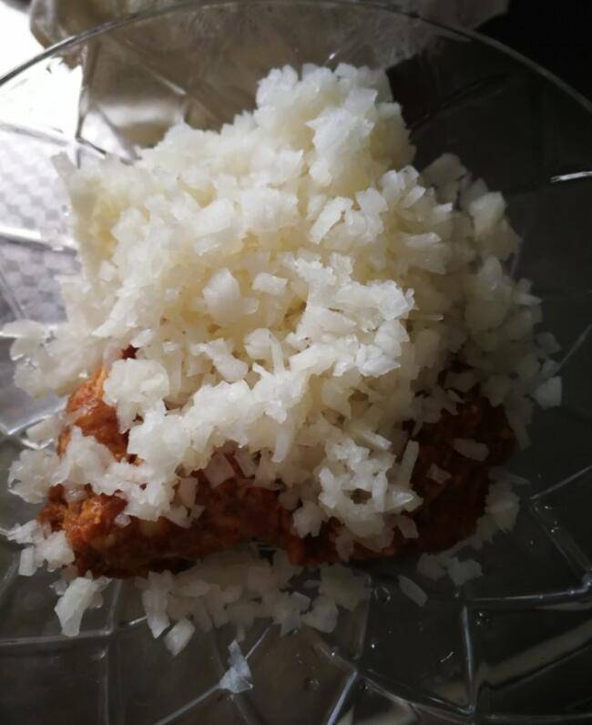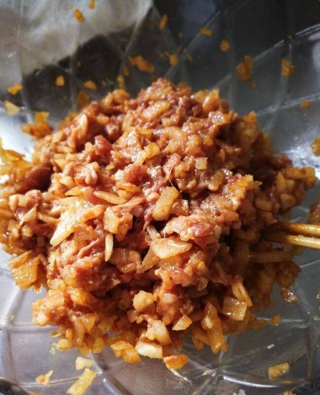 3、白萝卜攥出水分,放入肉馅里面。