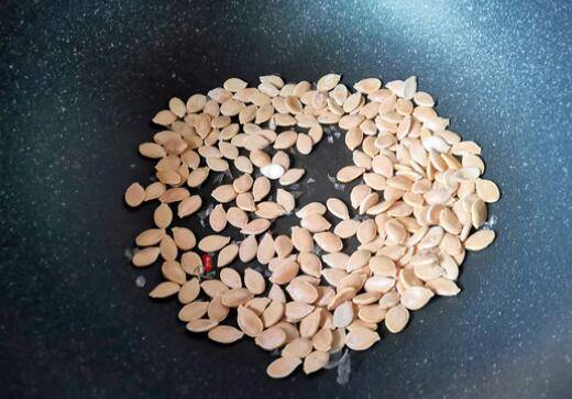 4、锅烧热,把晒好的南瓜子倒入,转小火,反复翻炒。