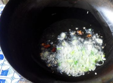 锅中放入底油,加入切好的葱花辣椒段爆香;