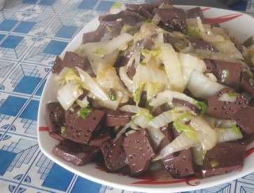 带白菜七成热时,加入事先炒好的血片;