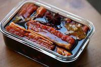 3、在彻底放凉的酱汁中,倒入1大勺白酒。然后把五花肉浸泡进去。放入冰箱,浸泡3天。