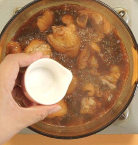 4、加料酒、老抽,倒清水没过猪蹄。