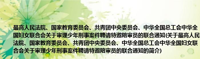 本文关于最高人民法院、国家教育委员会、共青团中央委员会、中华全国总工会中华全国妇女联合会关于审理少年刑事案件聘请特邀陪审员的联合通知的简介就讲解完毕,希望对大家有所帮助。